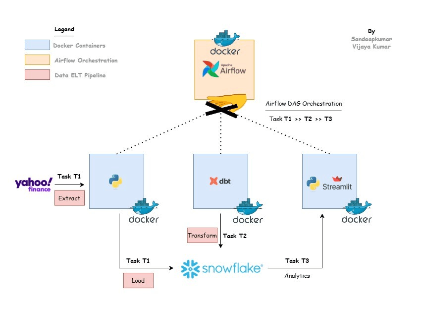 This project implements an ELT pipeline for stock portfolio analysis, leveraging Docker for containerization and Apache Airflow for workflow orchestration. The pipeline is designed to automate the data extraction, transformation, and loading (ETL) processes, followed by data analysis, all within a Dockerized environment. The system interacts with the Yahoo Finance API to fetch financial data, processes it using Snowflake and dbt, performs analysis using Python, and visualizes the results with Streamlit.